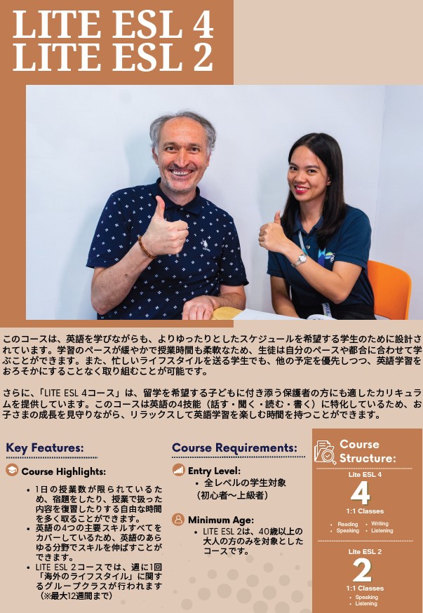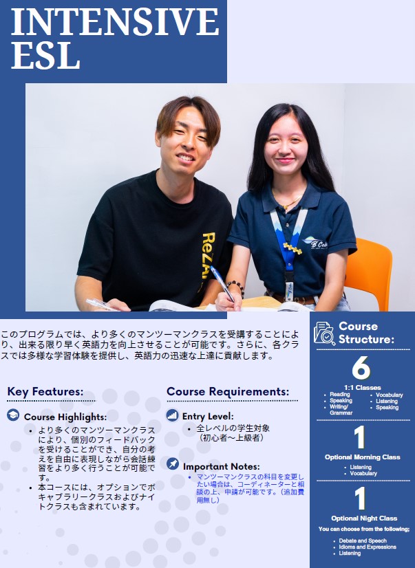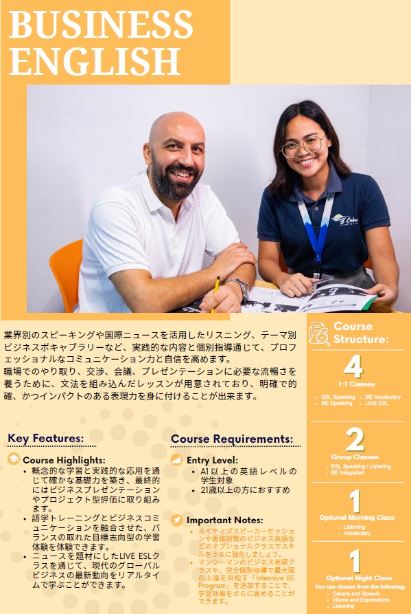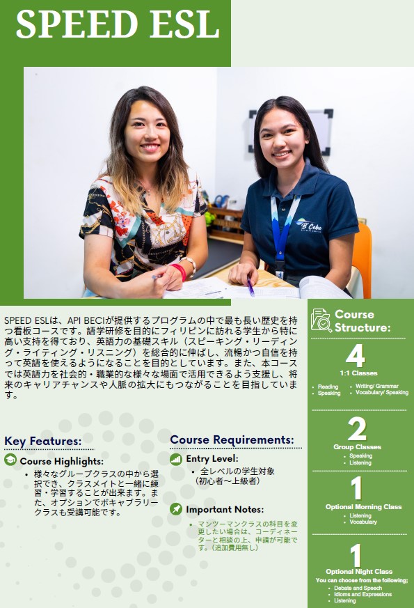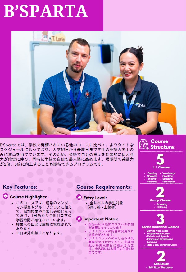 B’Cebuは、20年以上の英語教育の実績を持つAPI BECIの確⽴されたカリキュラムに基づいて運営されています。ESL, Sparta, IELTS, Business English, Lite, Juniorcoursesなど、多様なプログラムを提供しており、学習と⽣活の両⾯で最適な環境を実現するためのサポート管理体制が整っています。さらに、全ての運営責任者がフィリピンでの英語留学を⾃ら経験しているため、学⽣⽬線に⽴った学習環境づくりが徹底されています。